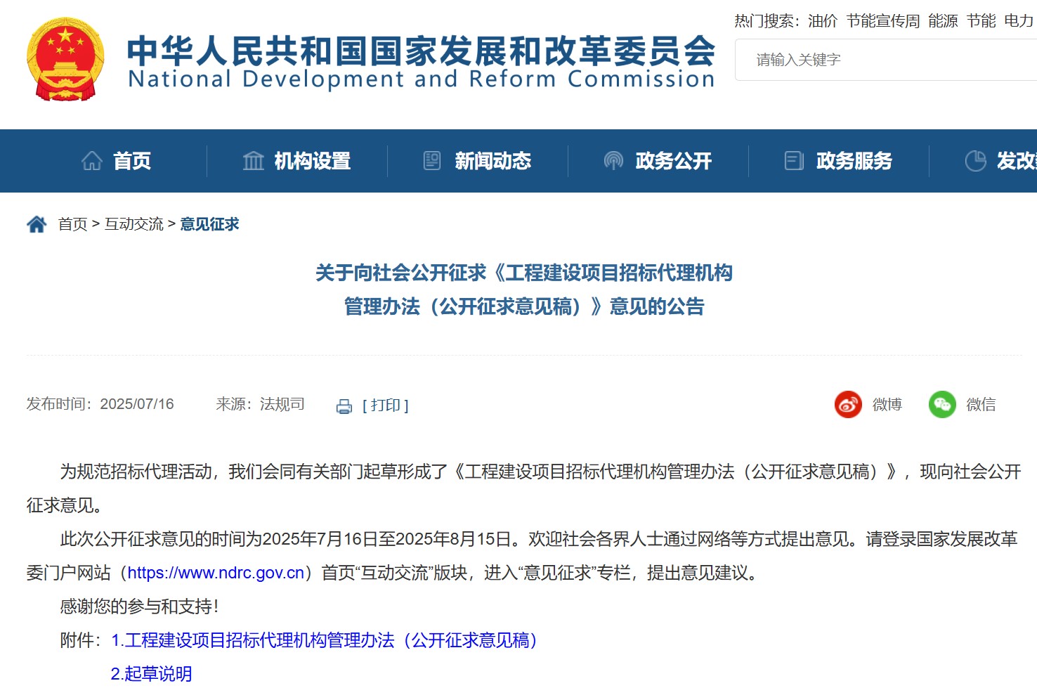 為規(guī)范招標代理活動,國家發(fā)展和改革委員會會同有關(guān)部門起草形成了《工程建設(shè)項目招標代理機構(gòu)管理辦法(公開征求意見稿)》,現(xiàn)向社會公開征求意見。此次公開征求意見的時間為2025年7月16日至2025年8月15日。
