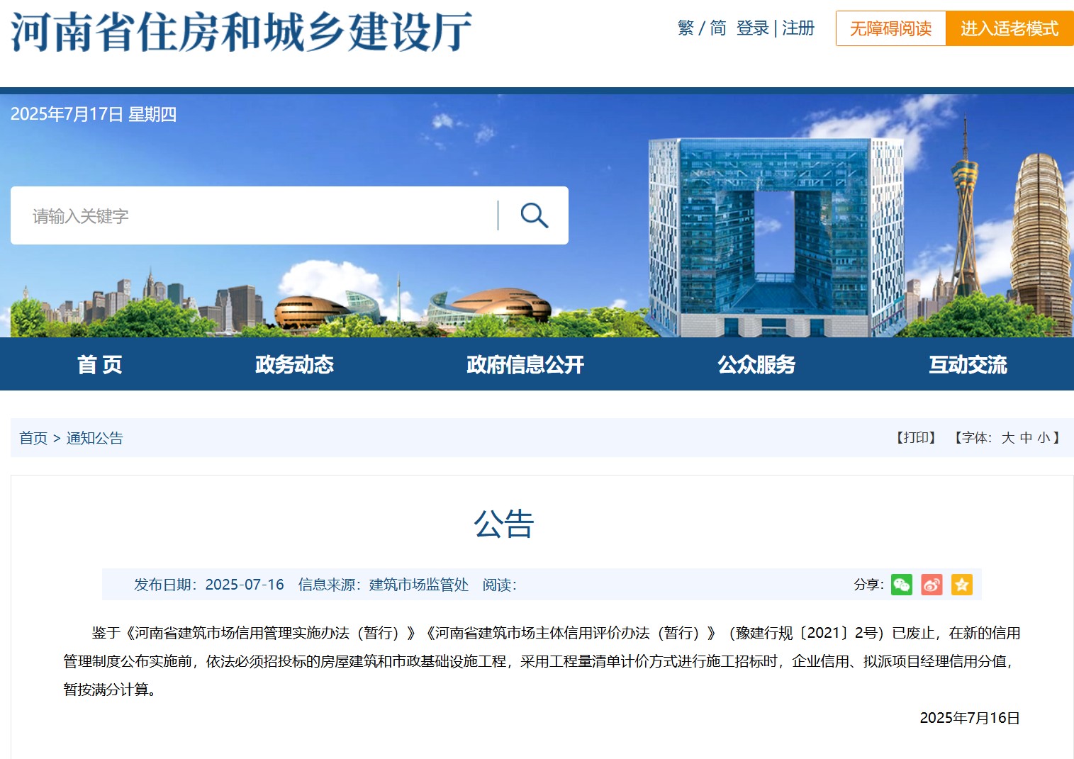 河南省住建廳發(fā)布關(guān)于房建、市政施工項目招標時信用分計算的公告